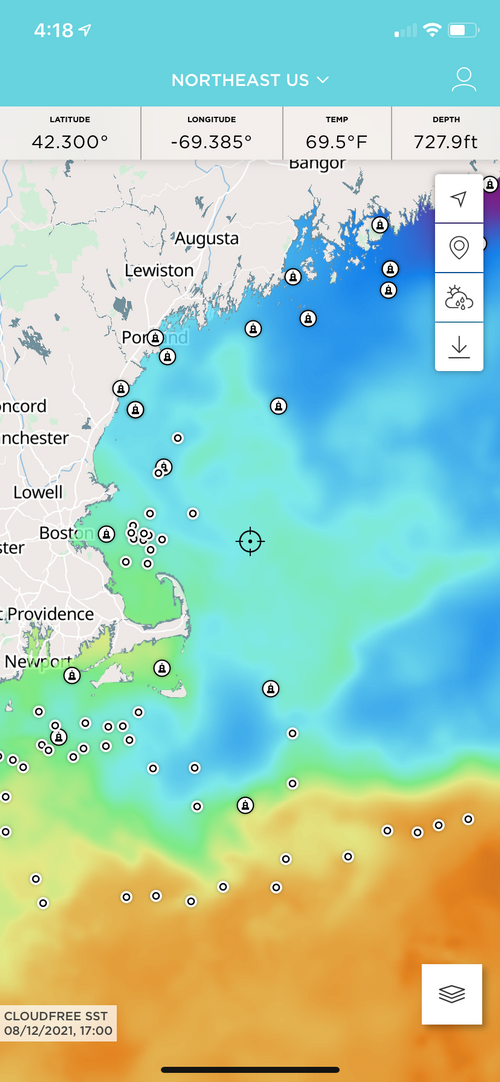 Download the FishTrack app now to view the latest Massachusetts and Maine Sea Surface Temperature (SST) Imagery.